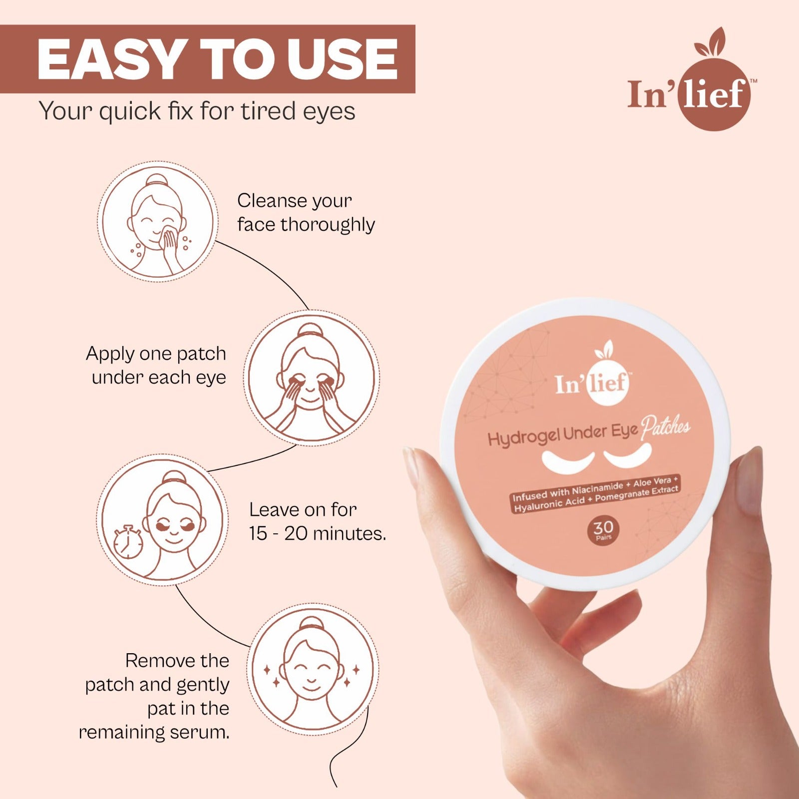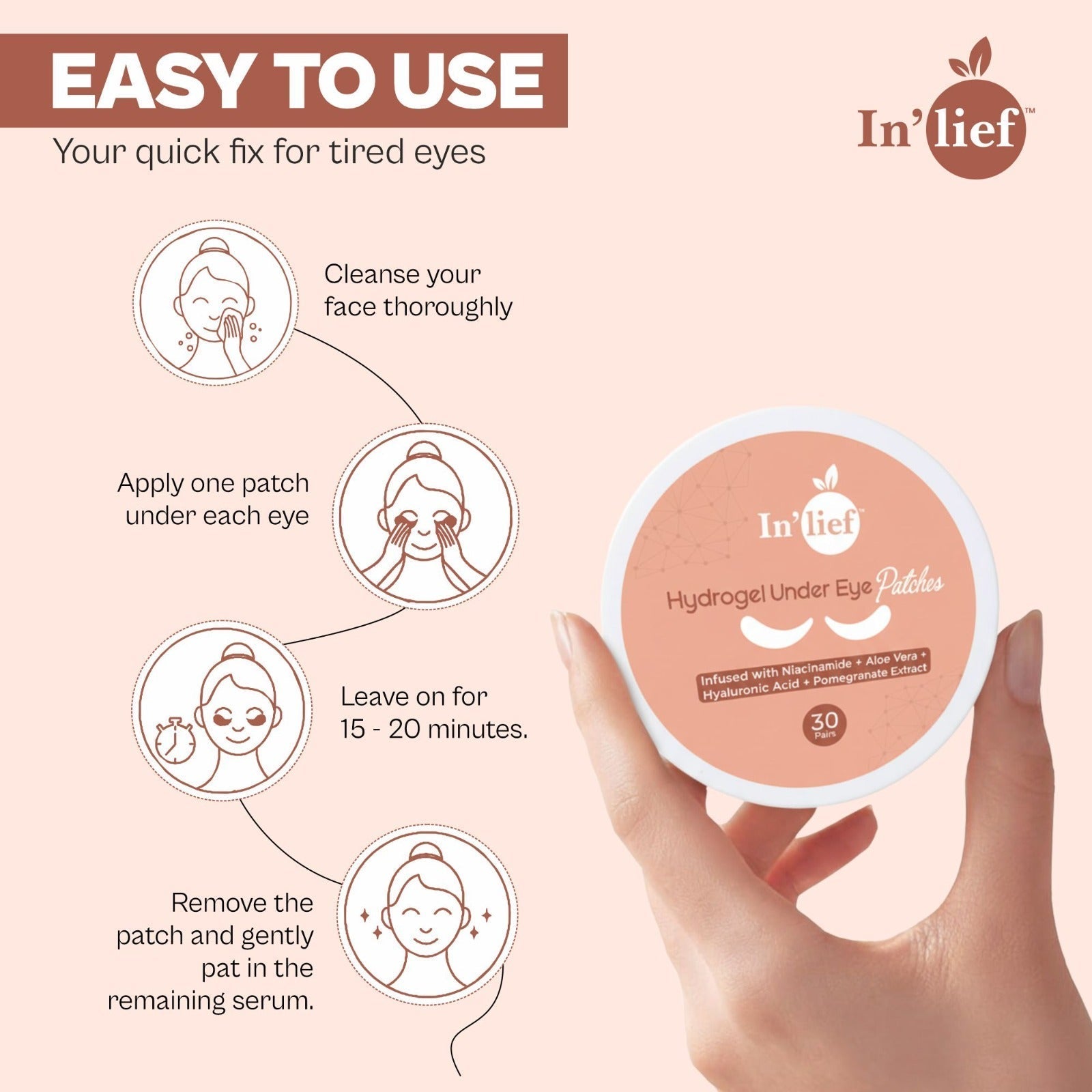 Say goodbye to tired, puffy eyes with In’lief Hydrogel Under Eye Patch, your everyday under-eye care solution. Each hydrogel patch is infused with Niacinamide, Aloe Vera, Hyaluronic Acid, and Pomegranate Extract — a powerful blend that hydrates, brightens, and soothes the delicate under-eye area. Designed to reduce dark circles, puffiness, and fine lines, these patches deliver an instant cooling effect while nourishing your skin deeply.